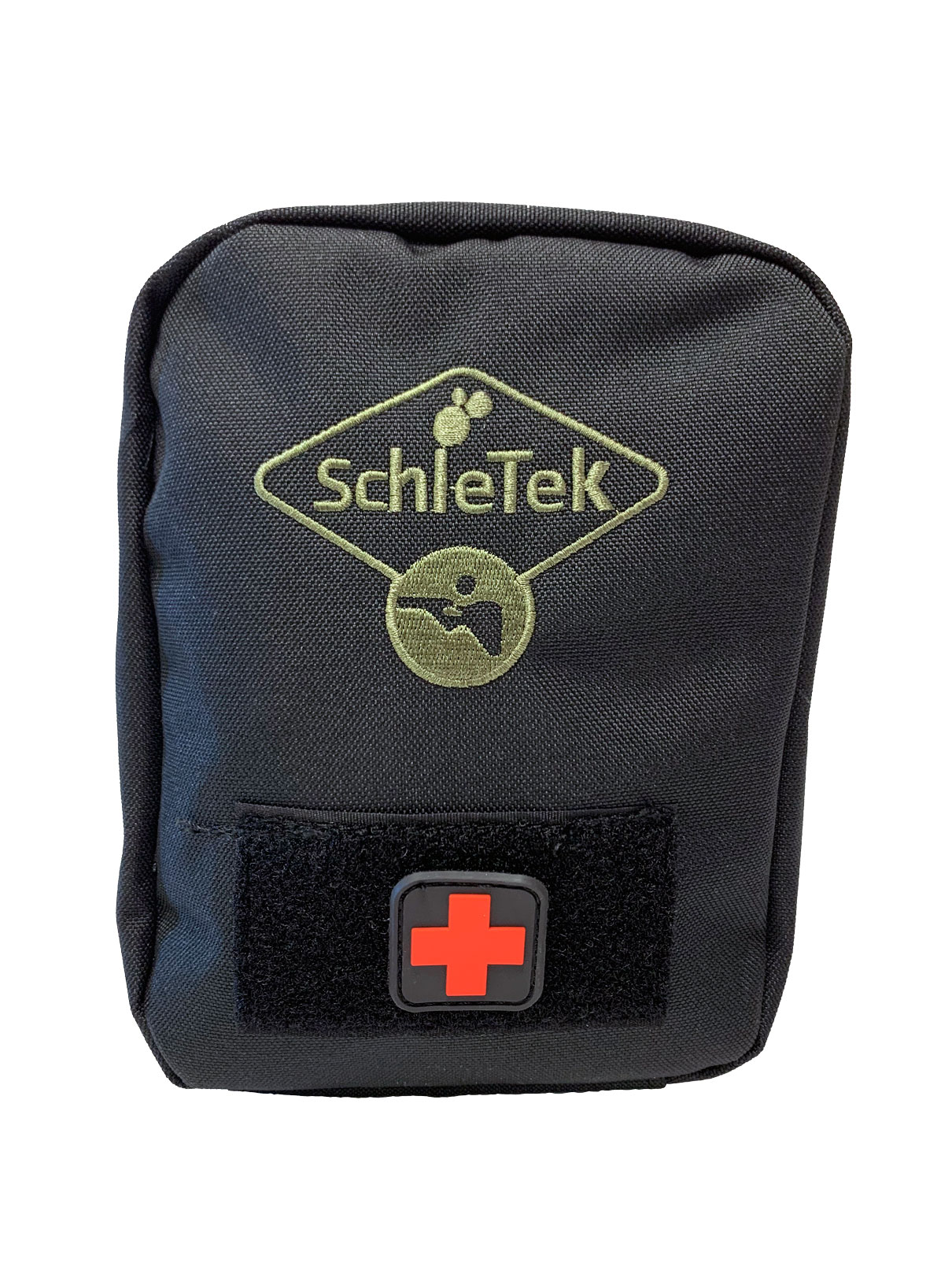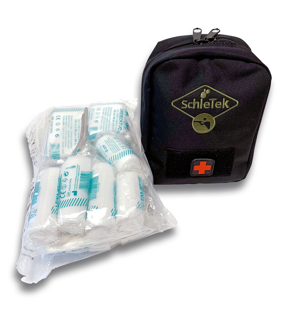Der Molle-Bag und das passende Verbandsmaterial sind jeweils auch separat erhältlich. Der Molle-Bag kann alternativ für Handel und Behörden frei nach Kundenwunsch mit SchleTek Produkten ausgestattet werden.