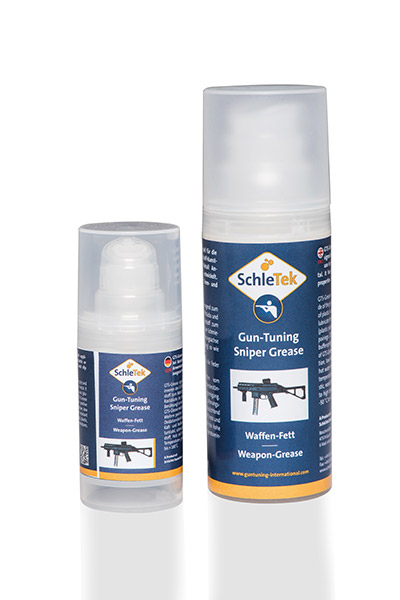 SchleTek Gun-Tuning Sniper-Grease ist ein speziell für Kunststoff-Kunststoff- und Kunststoff-Metall-Anwendungen entwickeltes Waffenfett. Es besitzt ausgezeichnete Trenn- und Gleiteigenschaften und eignet sich hervorragend überall dort, wo Kontaktflächen von Kunststoff zu Metall gegeben sind (z.B. bei Polymer-Griffstücken an Pistolen und Gewehren oder zum Schmieren der Raststücke bei der Sicherungsachse). Federgeräusche werden merklich reduziert.